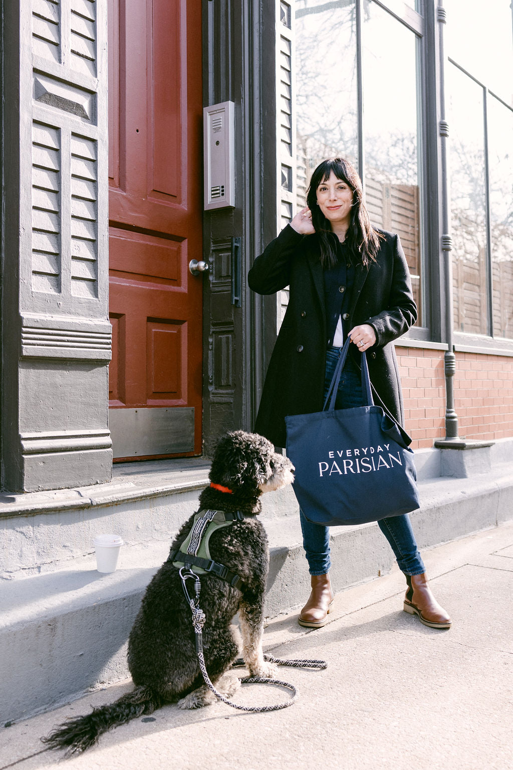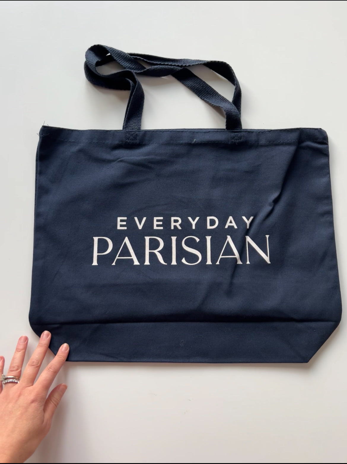 Introducing the Everyday Parisian navy tote bag. Perfect for market runs, grocery, and errands. The bag is wide enough to hold a good amount of items and the handles are sturdy for books!