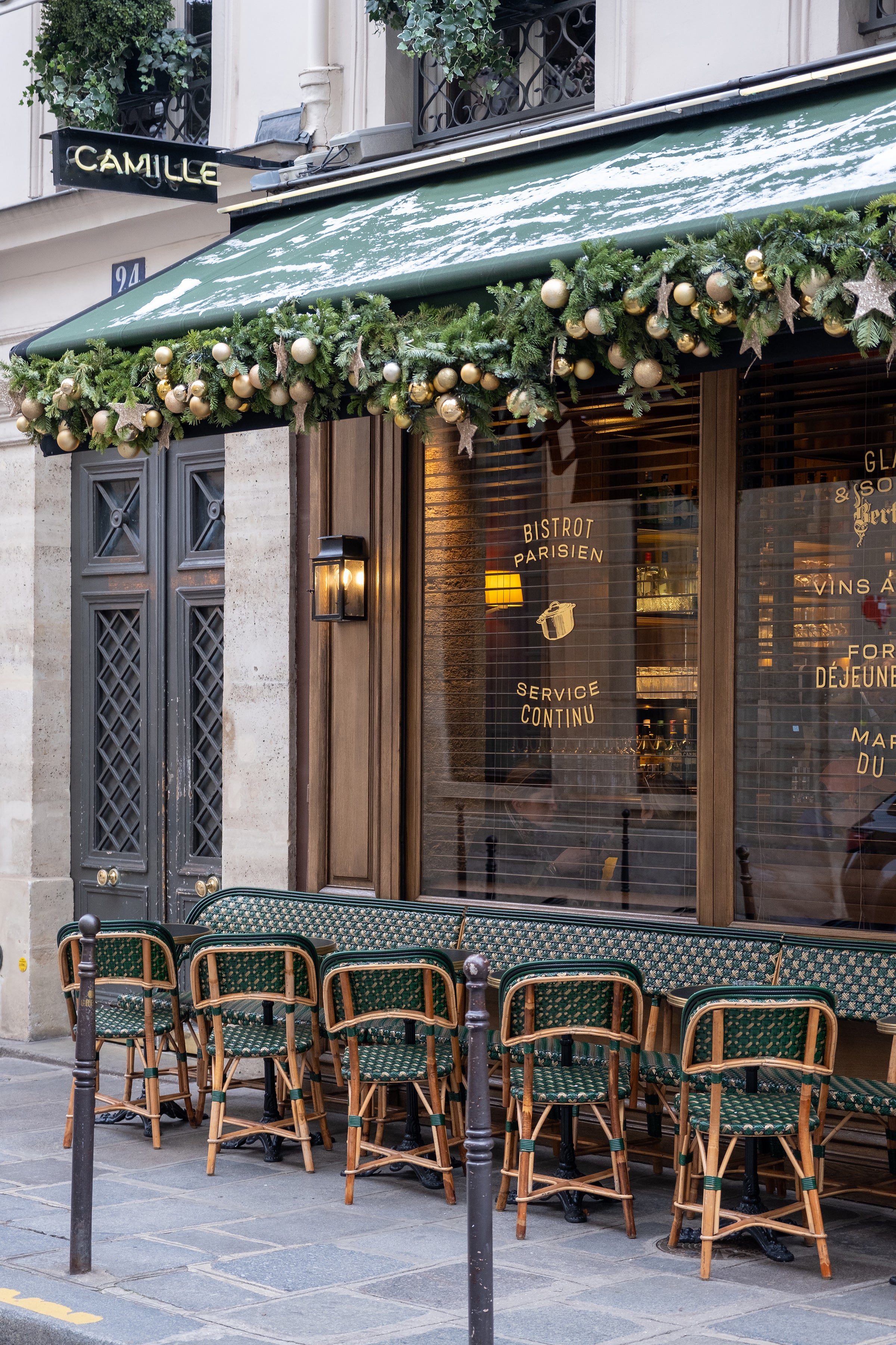 A snowy start to the winter morning in Paris at Café Camille in the Marais. The café has a fresh dusting of snow and decorated for the Christmas season.