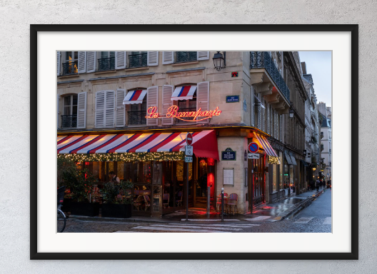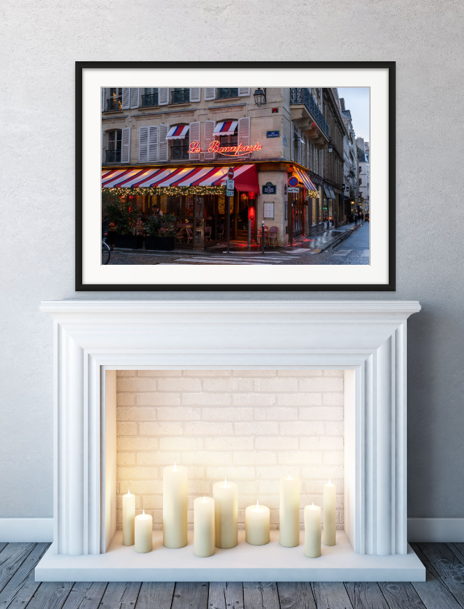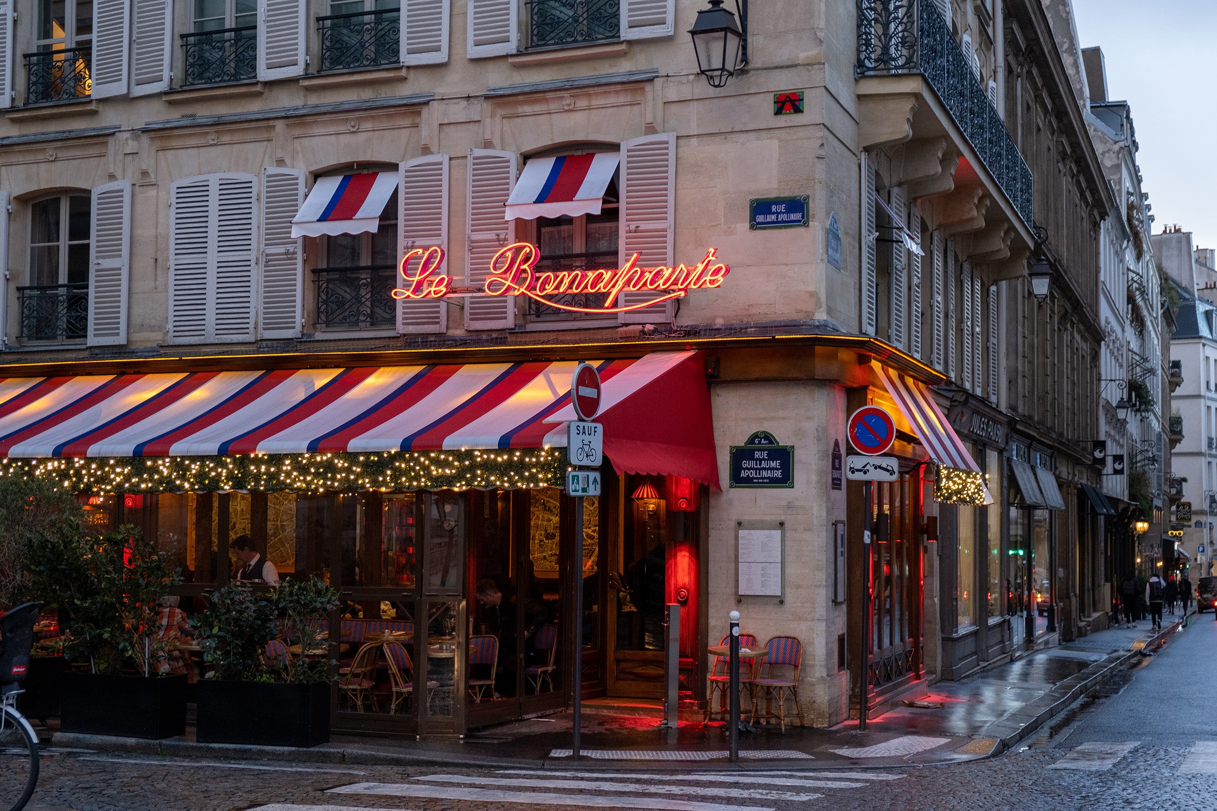 Tucked behind Café Les Deux Magots and Café de Flore sits Le Bonaparte. Sit outside for a glass of wine and people watching for an afternoon or evening. All dressed up in lights at Christmas.