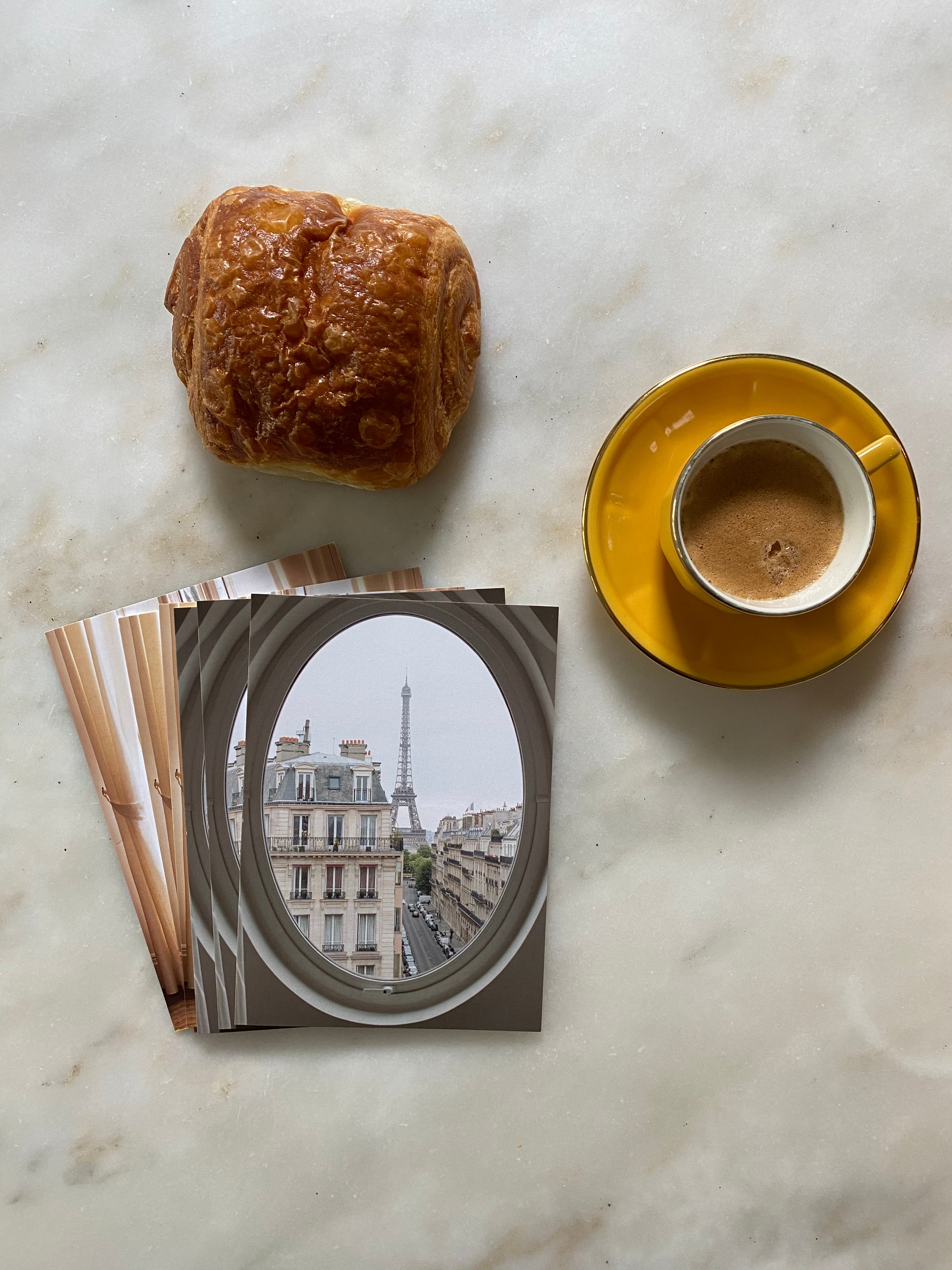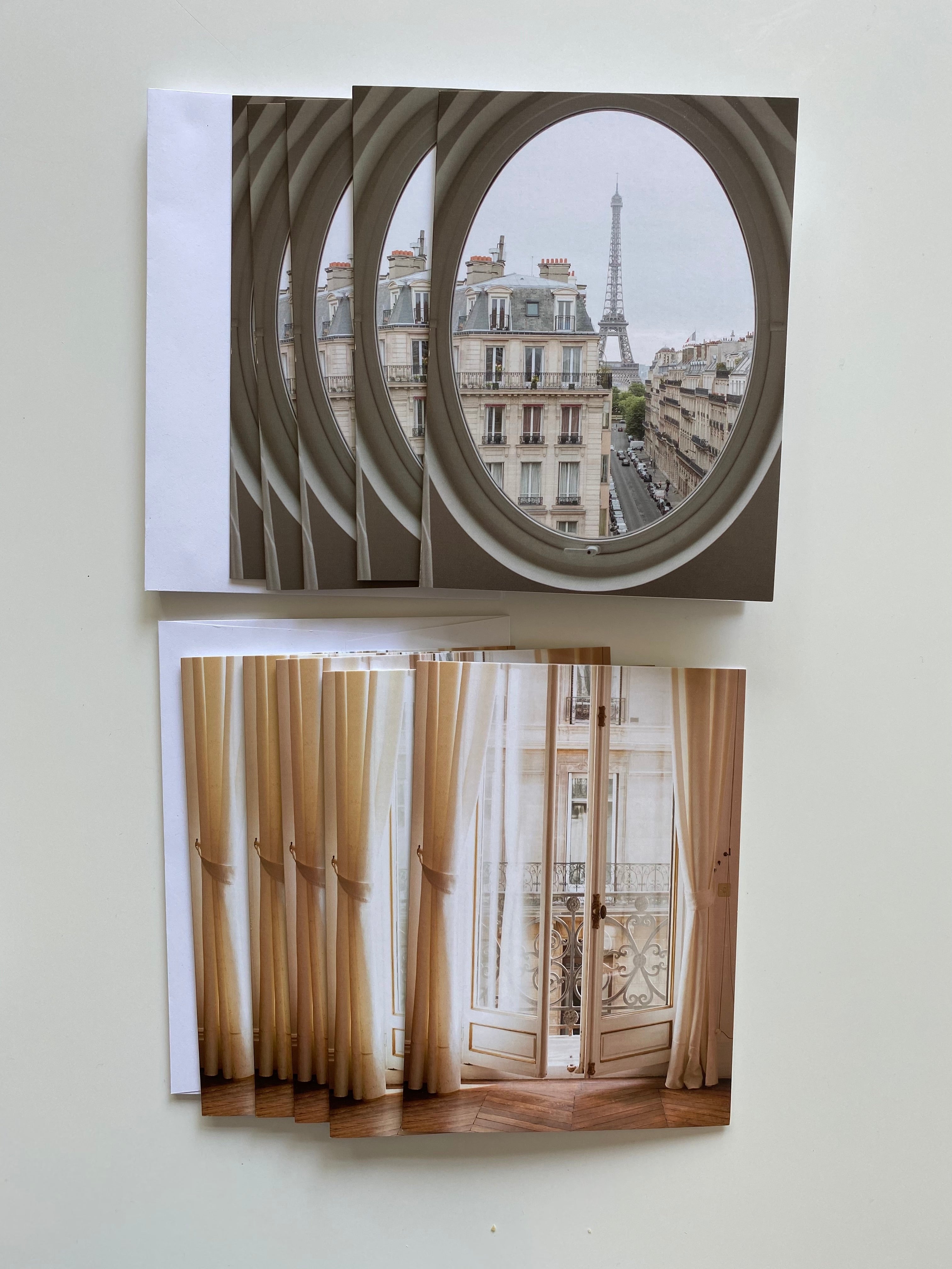 Say Hello with this Set of 10 notecards A7 measuring 5 x 7 French Notecard of my best selling Paris Eiffel Tower Window and Paris Apartment Photo. Includes 10 envelopes with the order.