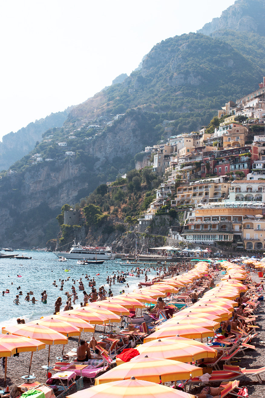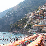 The beautiful coastline of Positano, Italy filled with beach umbrellas and sunbathers. From my Summer in Positano. I can't wait to get back for pasta and a spritz. Beautiful in person just as a postcard from Italy.
