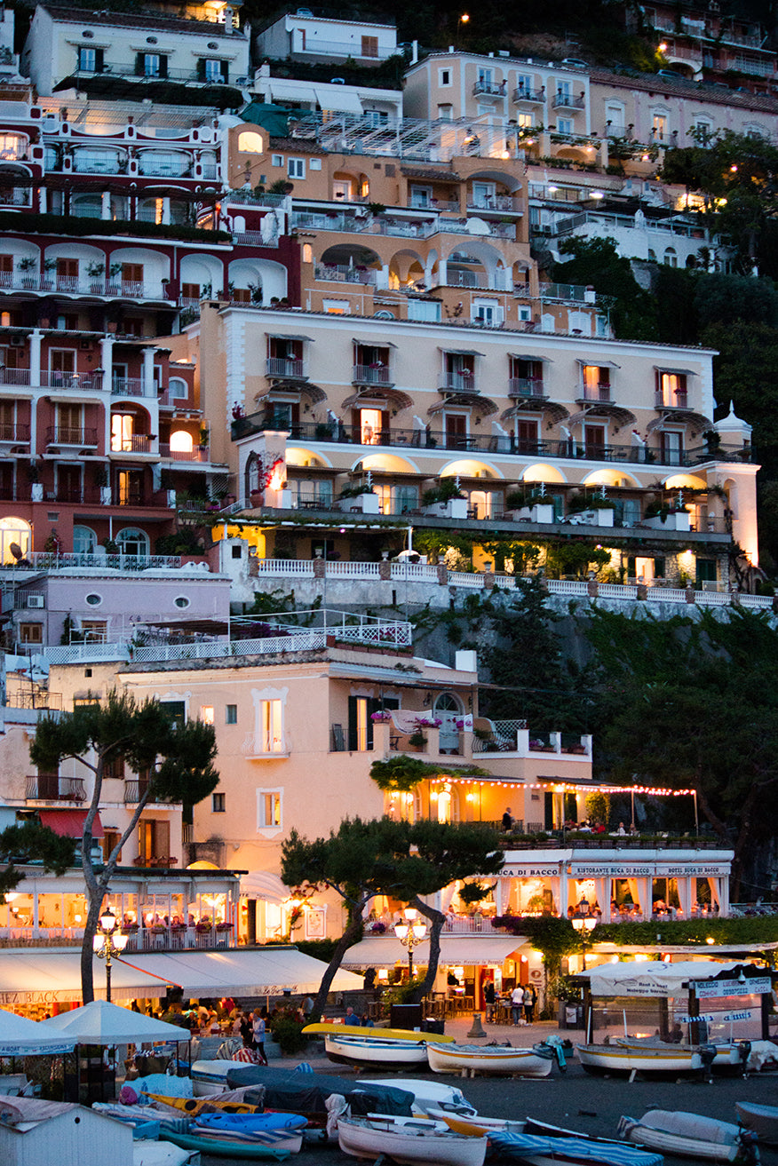 The beautiful coastline of Positano, Italy filled with beach umbrellas and sunbathers. August in Italy can be packed with Italian locals seeking out the sun and sea for their summer holiday.