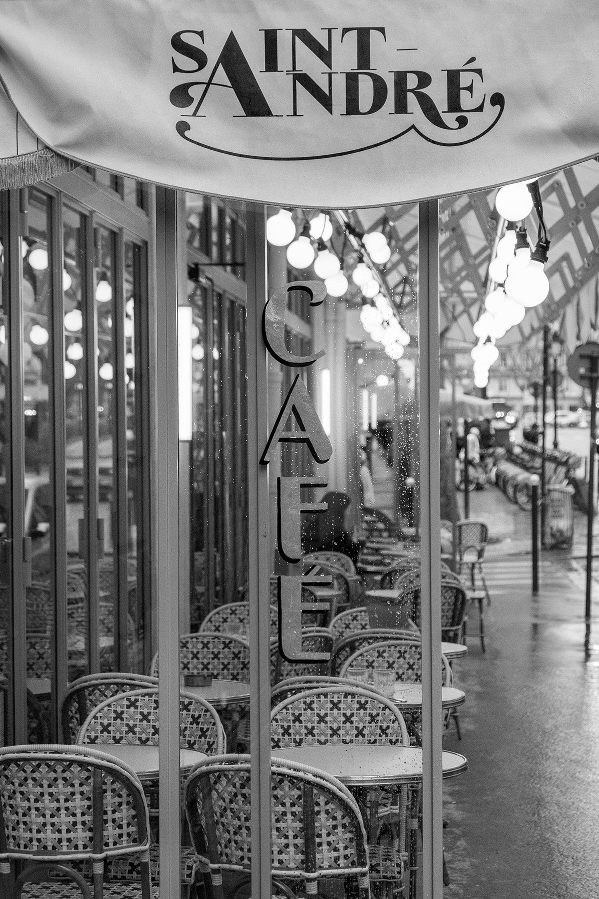 Café Saint-André Paris is on a tiny side street on the Left Bank on a rainy day.