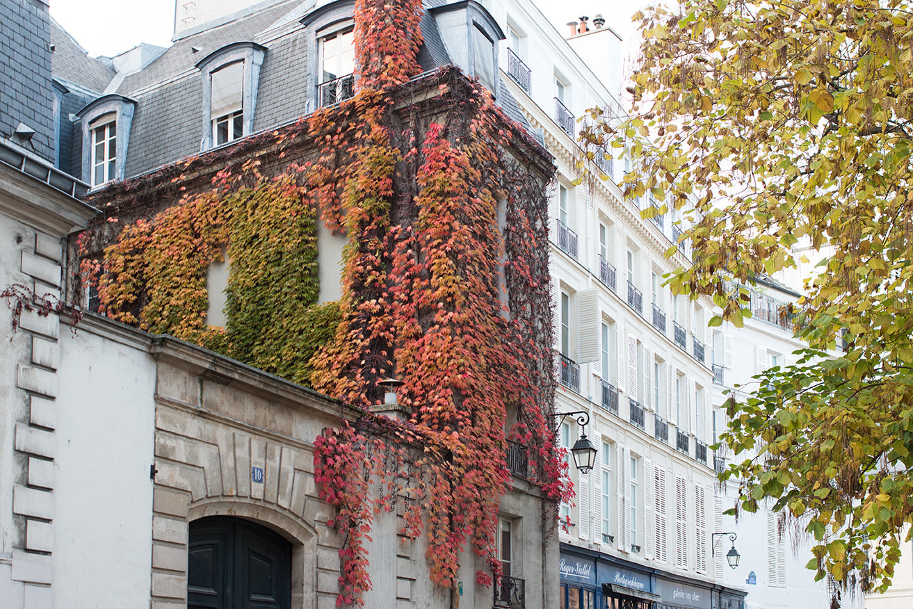 I discovered this courtyard in Paris a few years ago and I keep coming back year after year to see the display of Fall through the colors of the ivy. It goes from red to green and transitions through the colors.