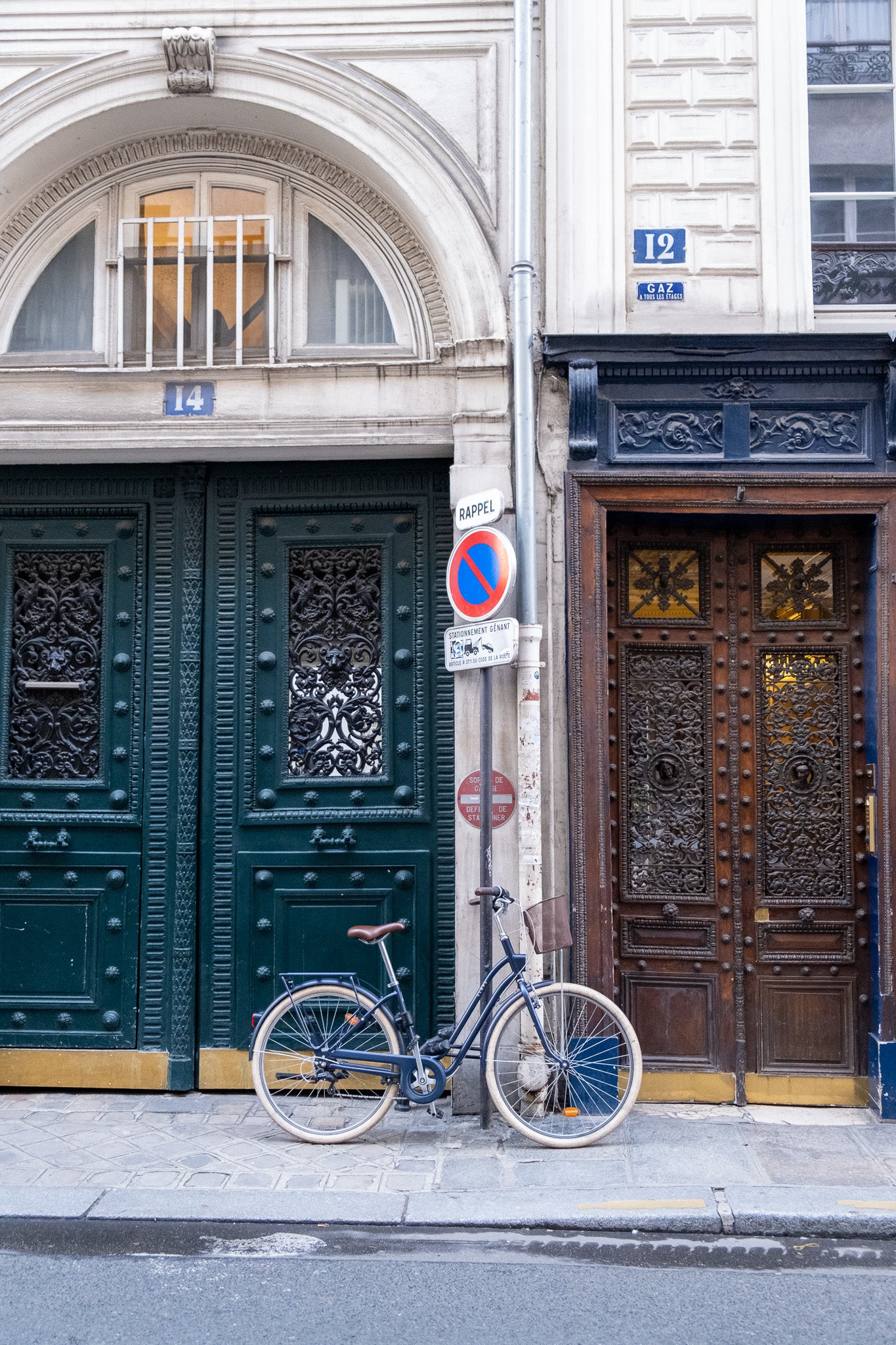 Walk down the streets of Paris and you are bound to find a bike parked outside of a cafe or restaurant. One minute the bike is parked and the next it is gone. I loved the parking between the two doors. Perfect placement.