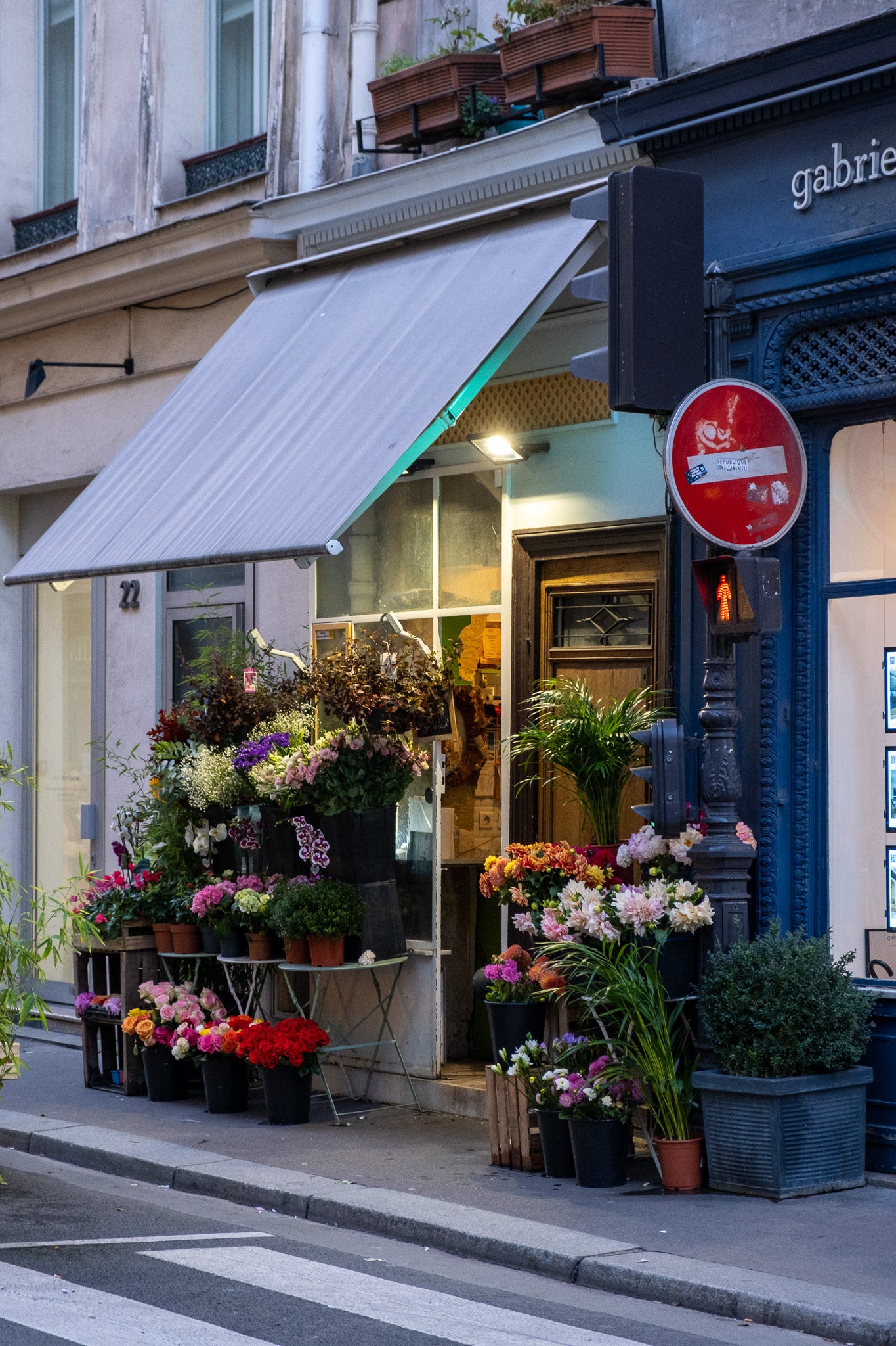 A flower shop on one corner and a boulangerie on the other. This is life in Paris.