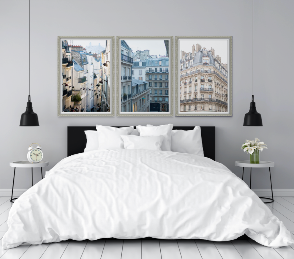 A mockup of what I ordered for my own bedroom at home. Three of my favorite pieces to hang above the bed. I used silver frames from Framebridge for 3 20x30 prints. The frames are not included. Use any size that works best with your space.